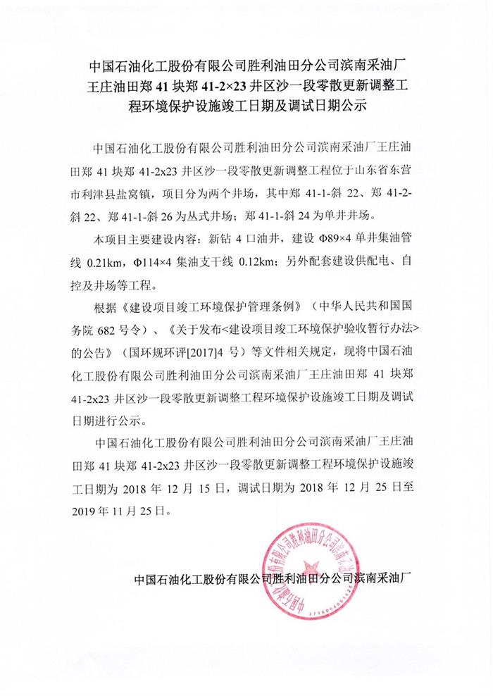 中國石油化工股份有限公司勝利油田分公司濱南采油廠王莊油田鄭41塊41-2×23井區沙一段零散更新調整工程環境保護設施竣工日期及調試日期公示