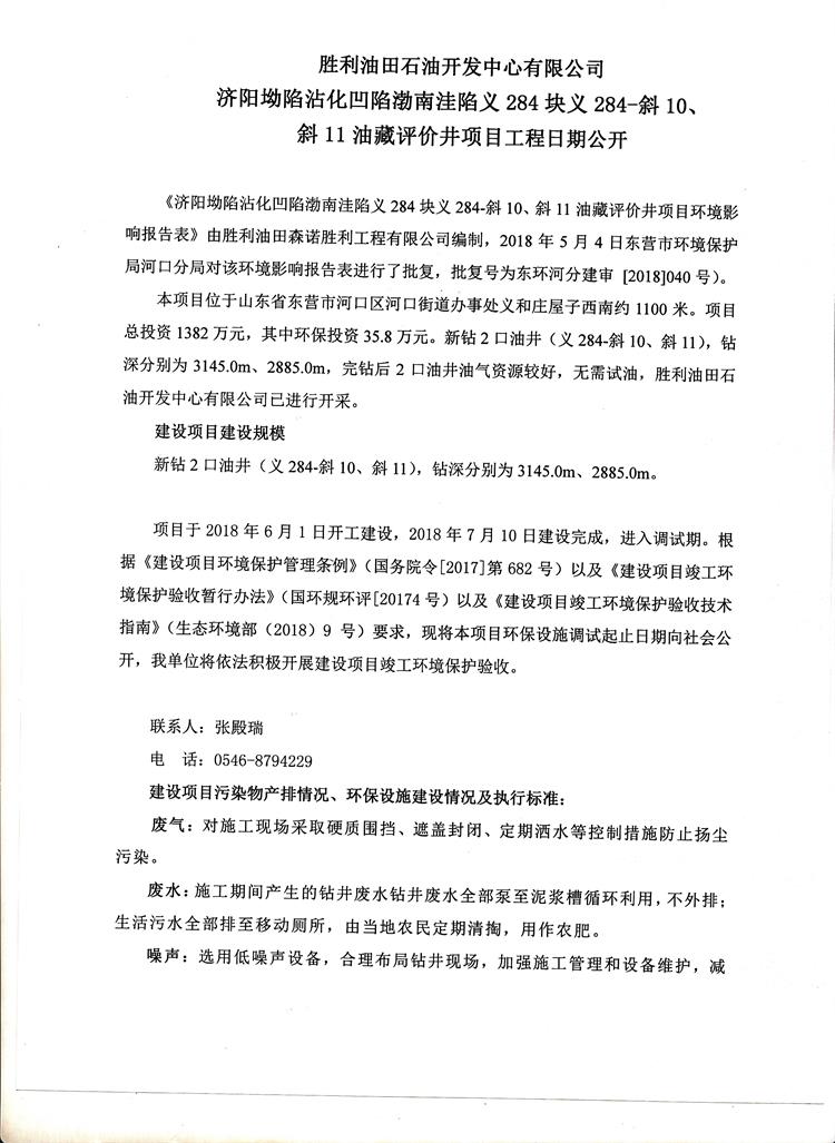 勝利油田石油開發中心有限公司濟陽坳陷沾化凹陷渤南洼陷義284塊義284-斜10、斜11油藏評價井項目工程日期公開